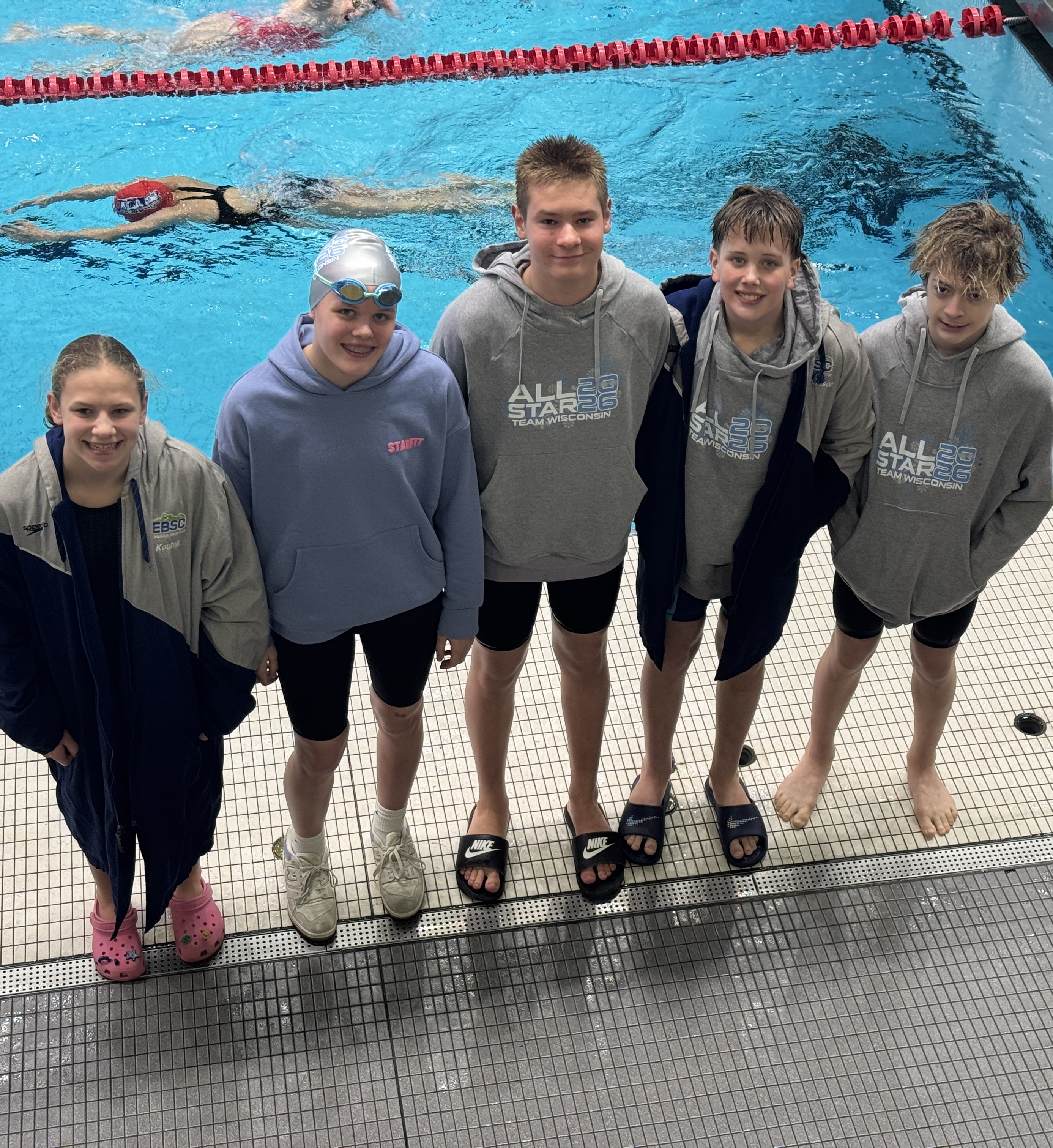 EBSC proudly had 7 members compete for Team Wisconsin last weekend at the 2026 Mid States All Star meet in Indianapolis. Athletes competed against swimmers from Indiana, Michigan, Ohio, Minnesota, and Kentucky. Congratulations to Adeline Koutnik. Sarah Johnson, Chase Miller, Tim Johnson, Lincoln Wildt , Alex Leibham (not pictured), and Abby Balter (not pictured)!